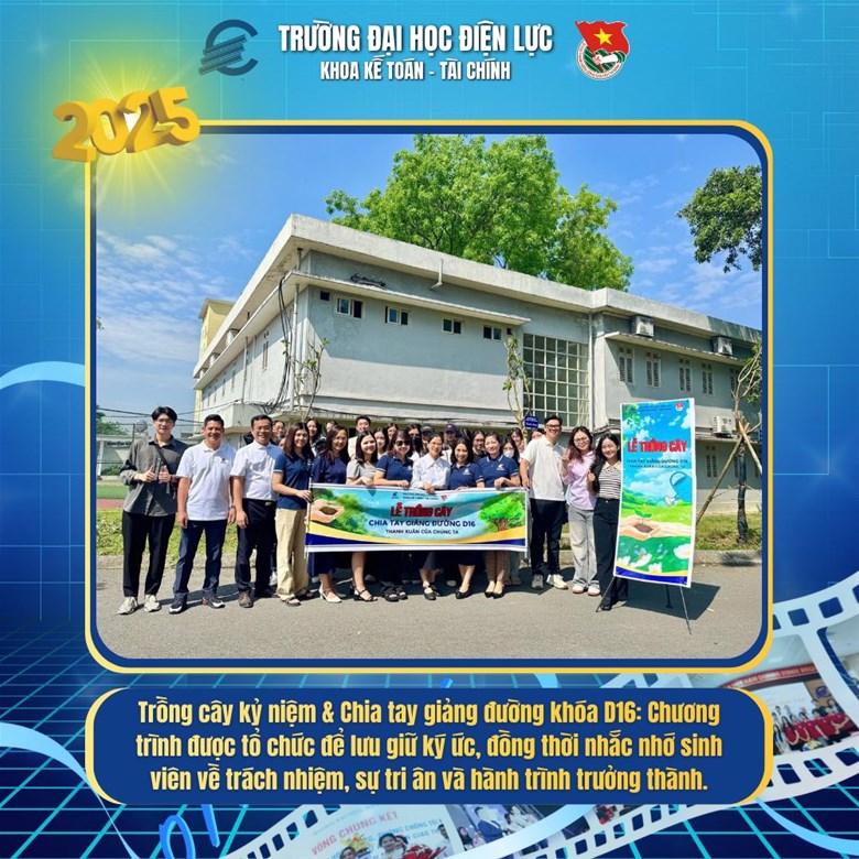 Trồng cây kỷ niệm & Chia tay giảng đường khóa D16: Chương trình được tổ chức để lưu giữ ký ức, đồng thời nhắc nhớ sinh viên về trách nhiệm với cộng đồng, ESG, phát triển bền vững, sự tri ân và hành trình trưởng thành.