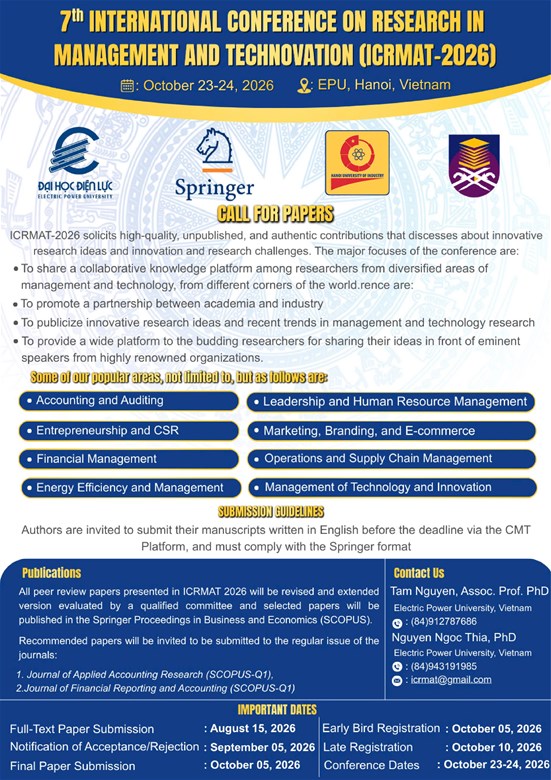 Trường Đại học Điện lực (EPU) trân trọng thông báo tổ chức Hội thảo khoa học quốc tế lần thứ 7 về Nghiên cứu trong Quản trị và Đổi mới công nghệ – ICRMAT 2026, phối hợp cùng Đại học Công nghiệp Hà Nội (HaUI) và Universiti Teknologi MARA (UiTM).